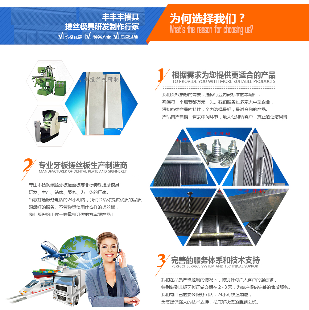 我們始終抱持著勤、誠、信的原則,致力于螺絲牙板、搓絲板產(chǎn)品專業(yè)廠商。多年來,由于全體同仁的勤奮、誠樸與使用客戶的支持與信任。造就三豐牙板品牌在業(yè)界樹立的良好形象,也建立了品質(zhì)保證的優(yōu)良信譽。勤、誠、信是三豐牙板全體同仁共同遵循的中心理念,更是我們服務(wù)客戶的宗旨。主營產(chǎn)品:不銹鋼搓絲板,不銹鋼機絲倒角切平牙板,D/W雙線單出(ss)墻用細牙搓絲板,機絲束桿圓尾牙板,機絲帶圈位螺絲牙板,高低牙自攻牙板,機絲帶溝五溝牙板,不銹鋼扭花紋搓絲板,牛仔釘牙板,直齒搓花板等搓絲模具。產(chǎn)品可滿足國標(GB)、德標(DIN)、美標(ANSI)、日標(JIS)、國際標準(ISO)等各種國際通用標準,并能根據(jù)客戶實際要求,設(shè)計訂做各種特殊非標規(guī)格...